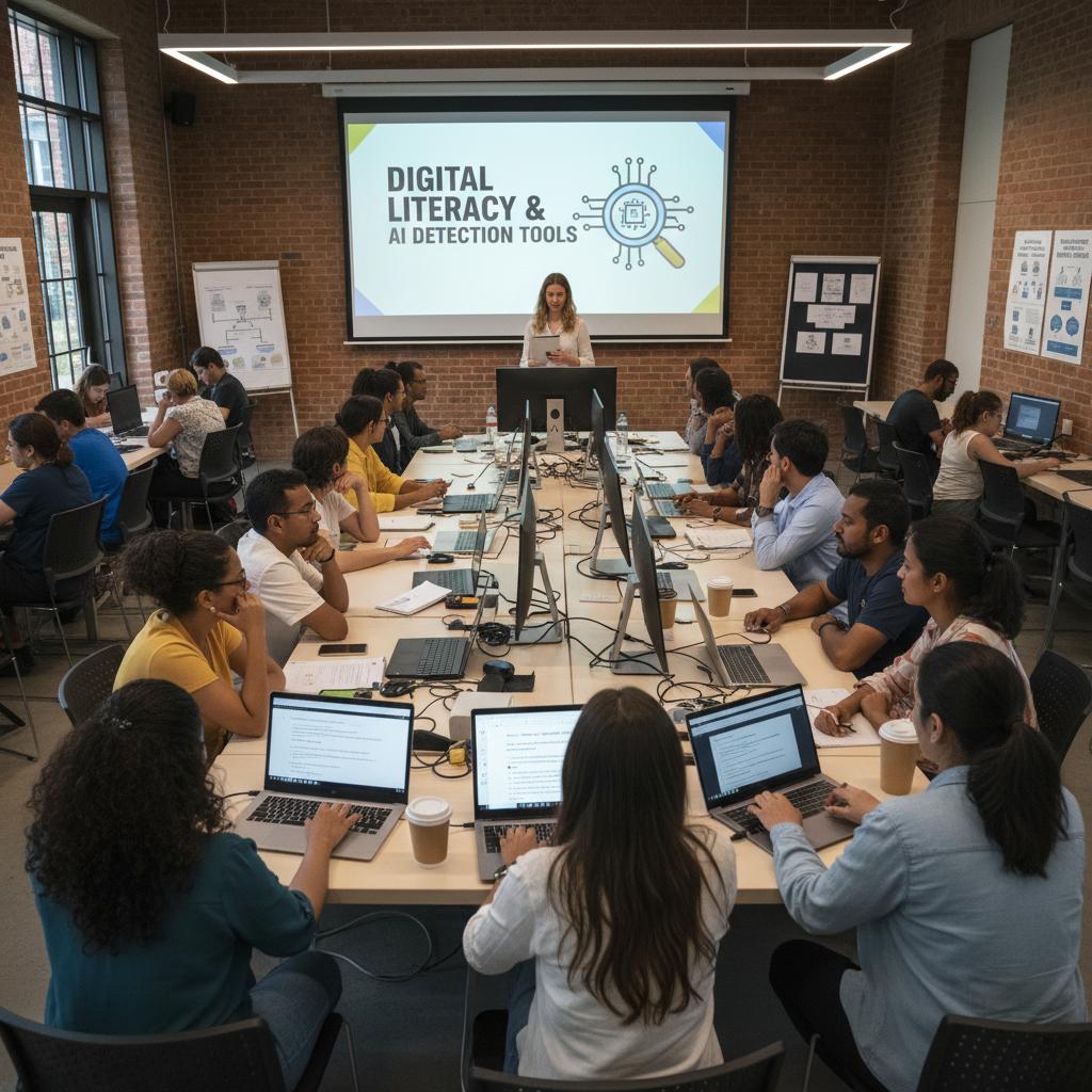 Photo of a community workshop on digital literacy, people interacting with AI-detection tools—a hopeful vision for digital resilience.