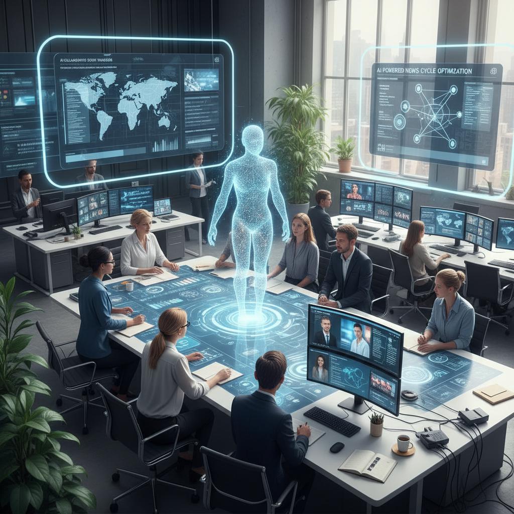 Alt text: Journalists working comfortably alongside AI tools in a modern newsroom, highlighting AI-generated journalism software benefits