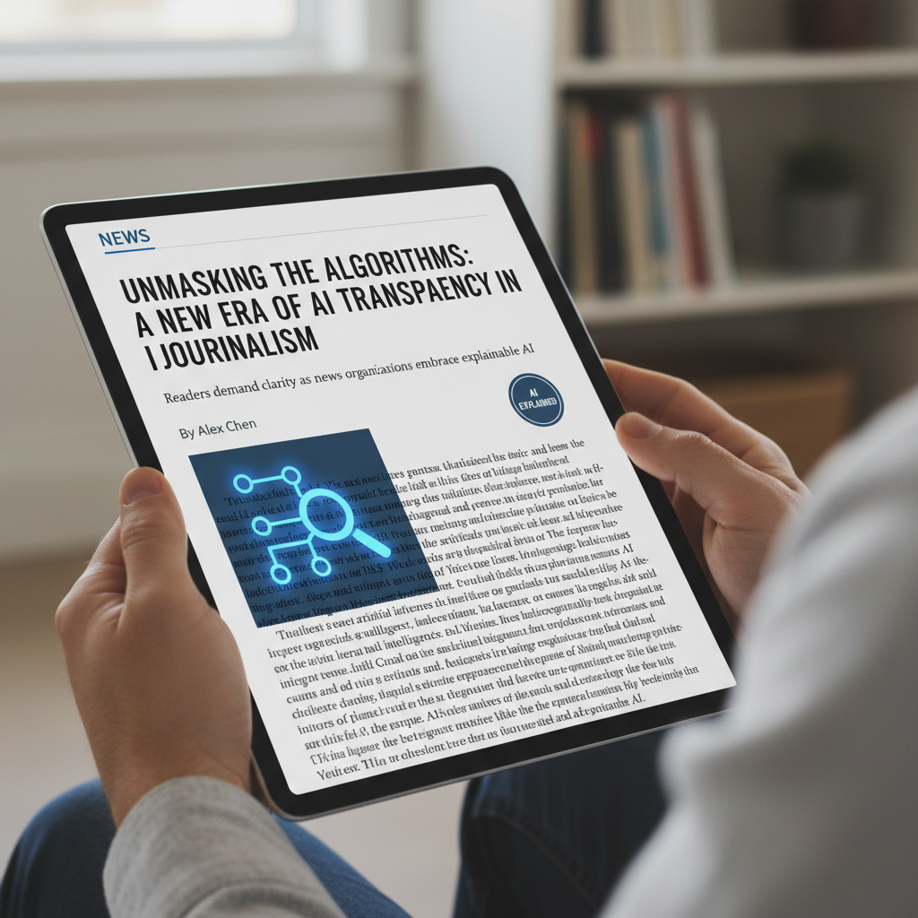 Alt text: Reader assessing transparency in AI-generated journalism, news automation software efficiency in focus