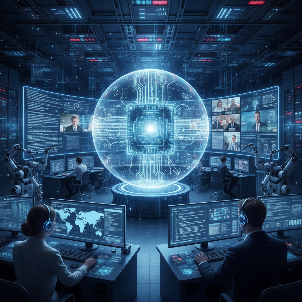 Staying ahead in the AI journalism revolution: futuristic newsroom with holographic AI. Alt text: 'Futuristic newsroom with holographic AI displays and team collaboration.'