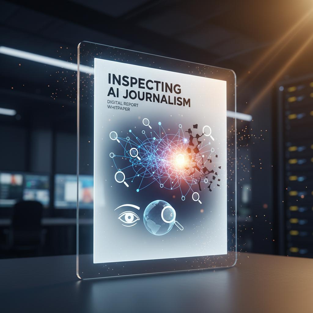 Image: Inspecting AI-generated journalism whitepaper for trustworthiness: person scrutinizing digital report in dramatic lighting