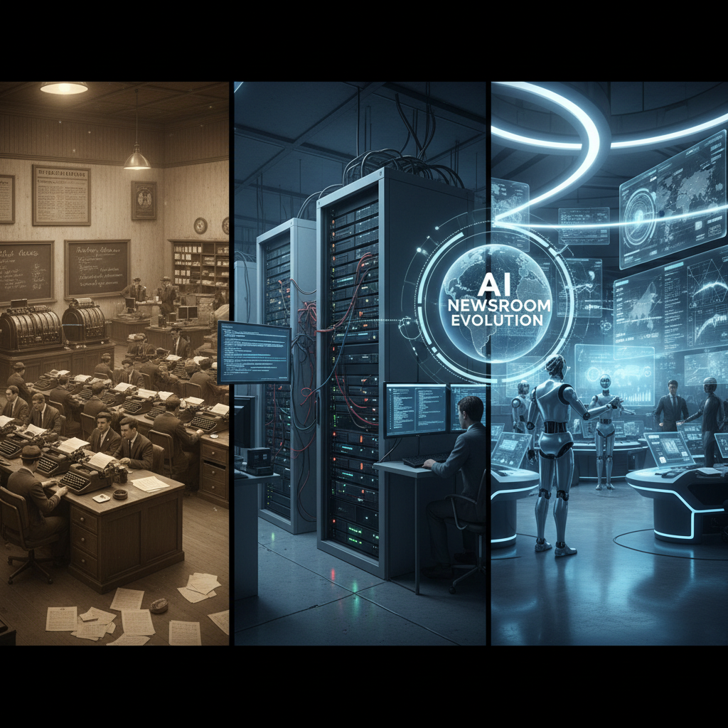 Alt: Timeline of newsroom technology evolution highlighting AI-generated news employment