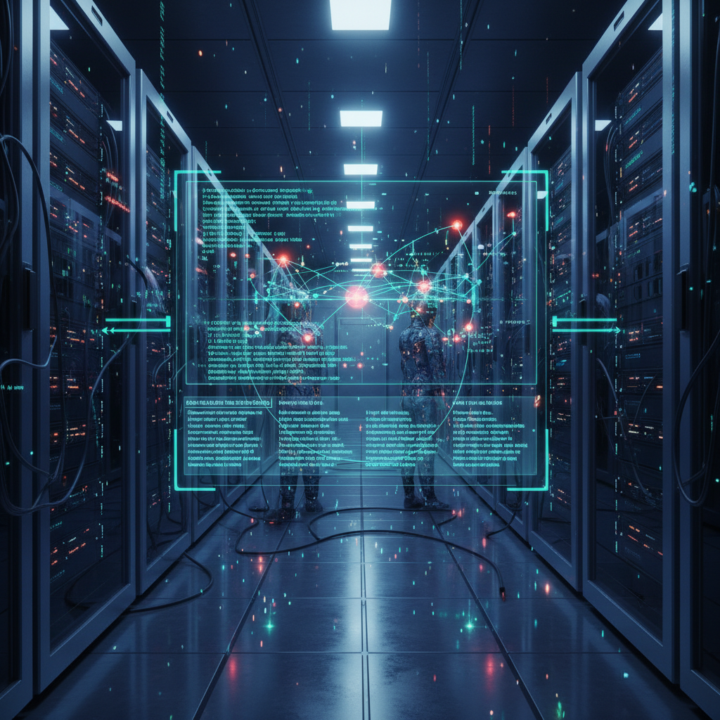 Alt text: Server racks with AI code and data visualizations projected, symbolizing the advanced algorithms behind AI-generated news marketing and newsroom automation.