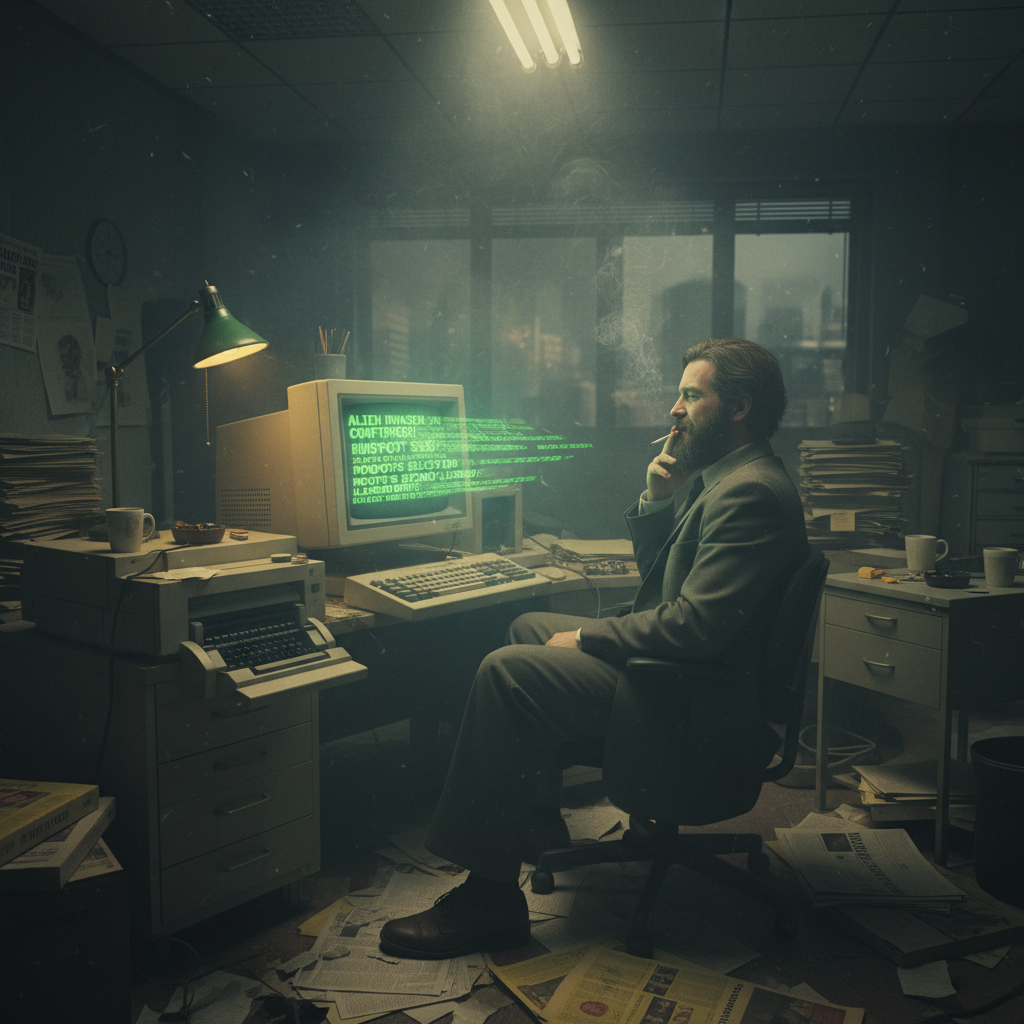 Photo of a 1990s newsroom, smoke curling over a beige PC spitting out awkward auto-generated headlines.