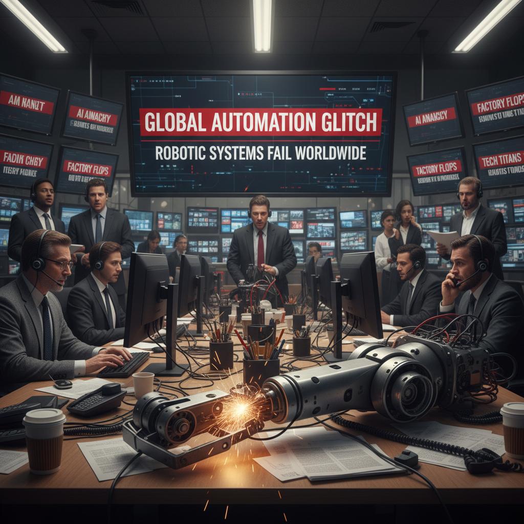 Alt: Broken robot arm holding a newspaper with flawed news headlines in a tense newsroom