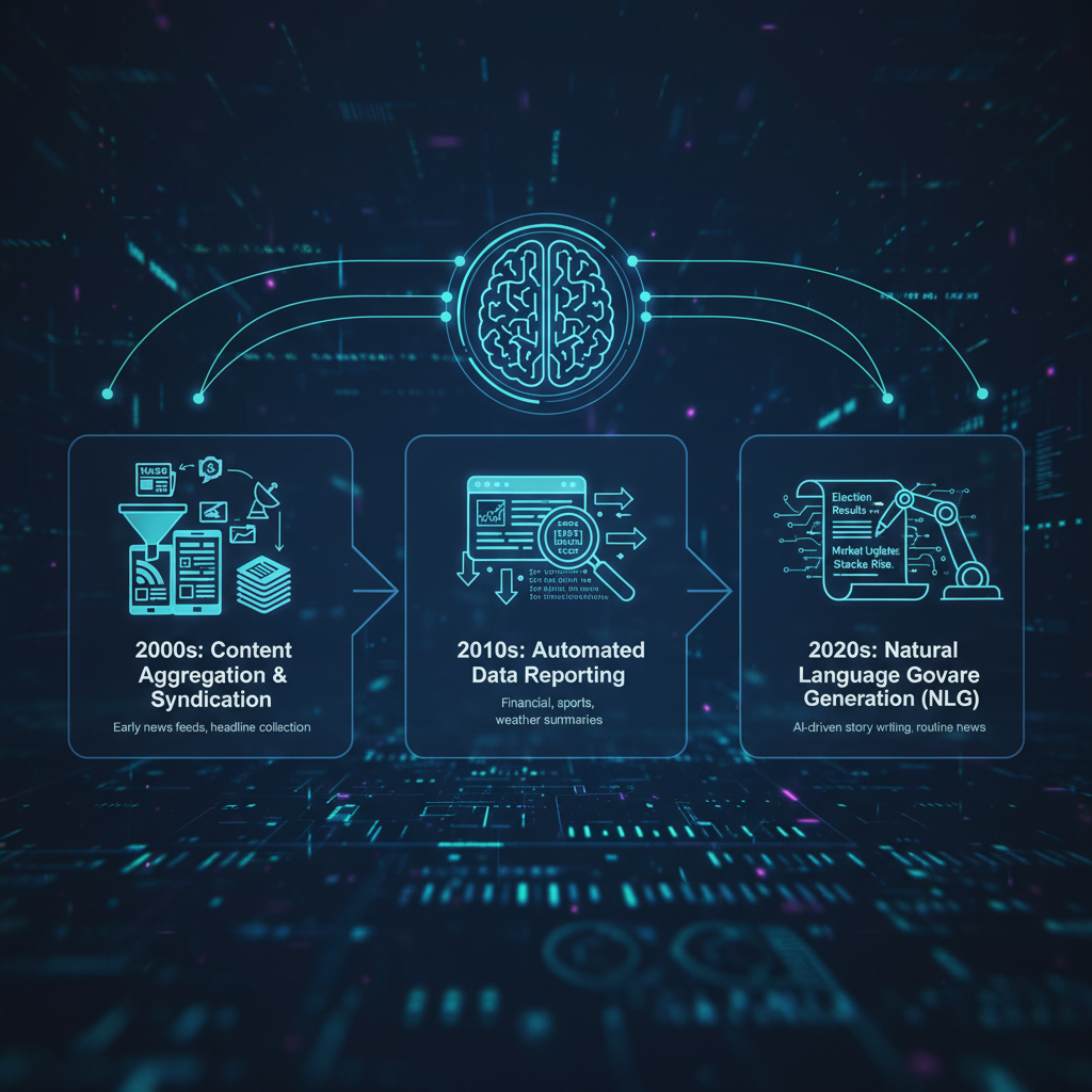 Technological evolution of news automation, with symbolic newsroom moments and AI code