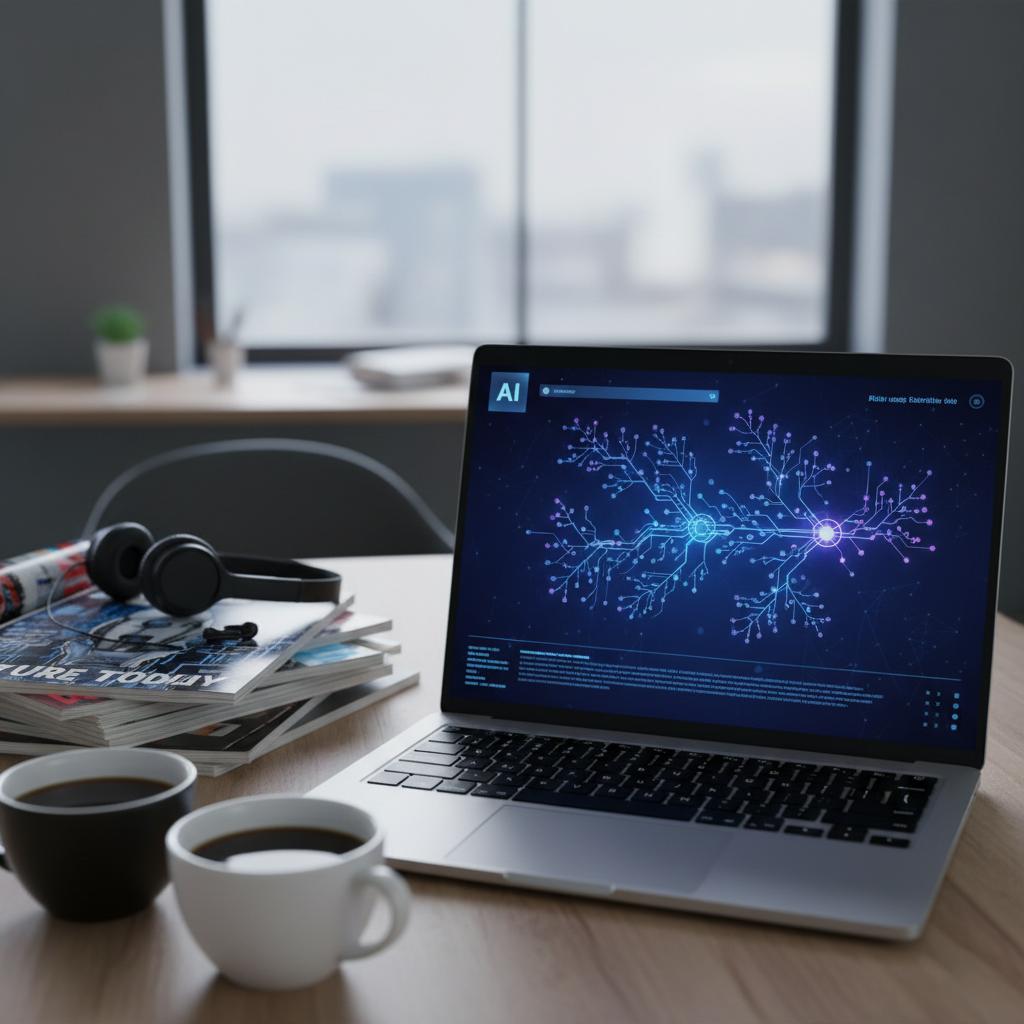 Narrative photo of an AI interface on a laptop surrounded by coffee cups and half-read tech magazines