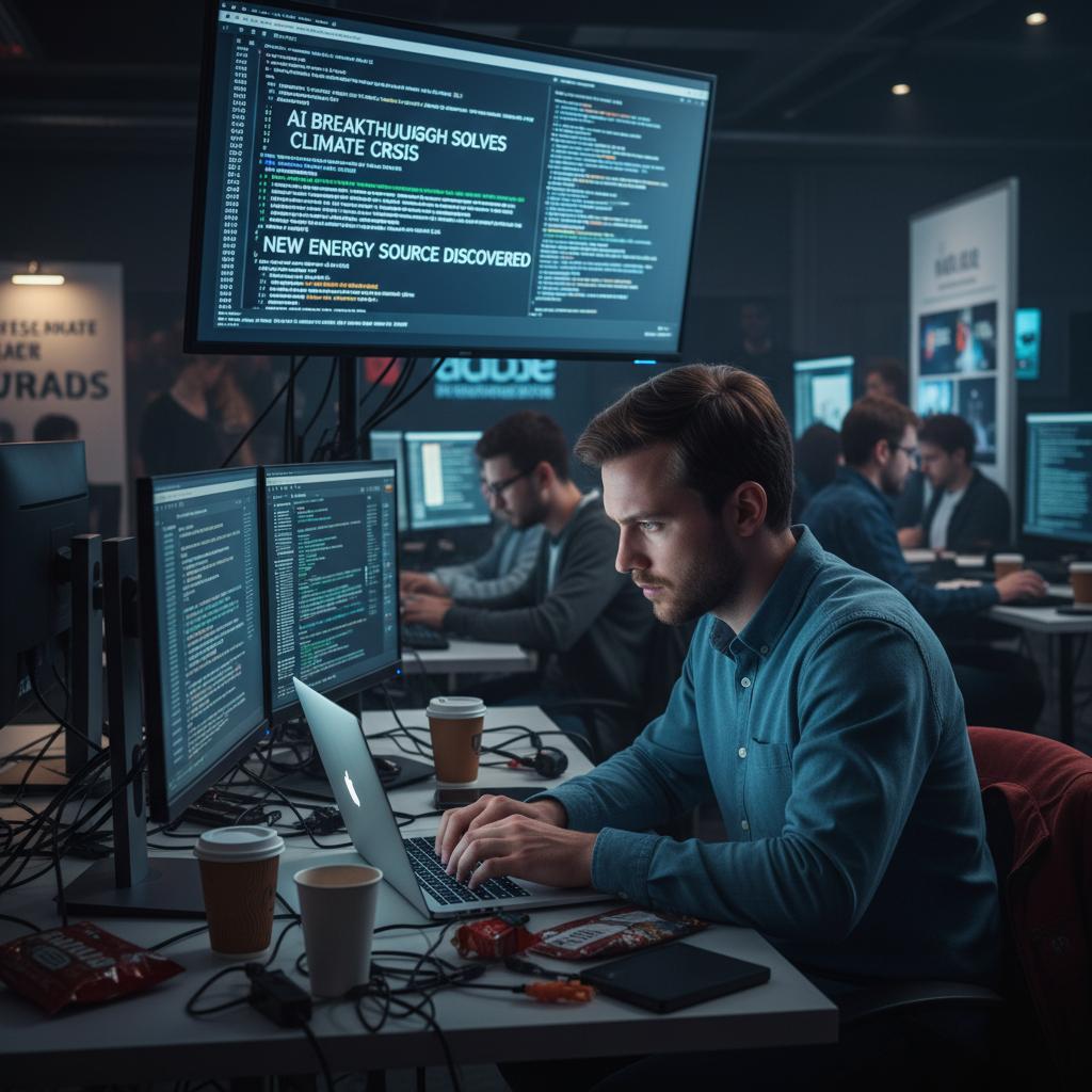 Cinematic photo of a young journalist at a late-night hackathon, screens aglow with code and headlines